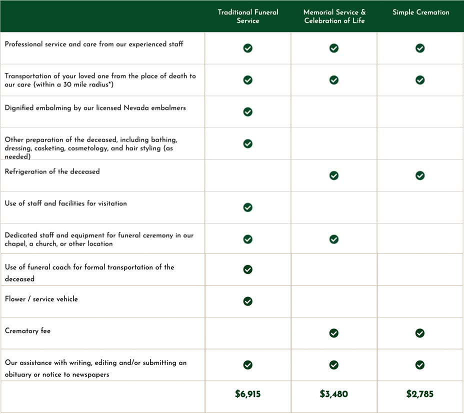 We offer three main service packages for your convenience. For more information, see the General Price List for the location you are interested in.